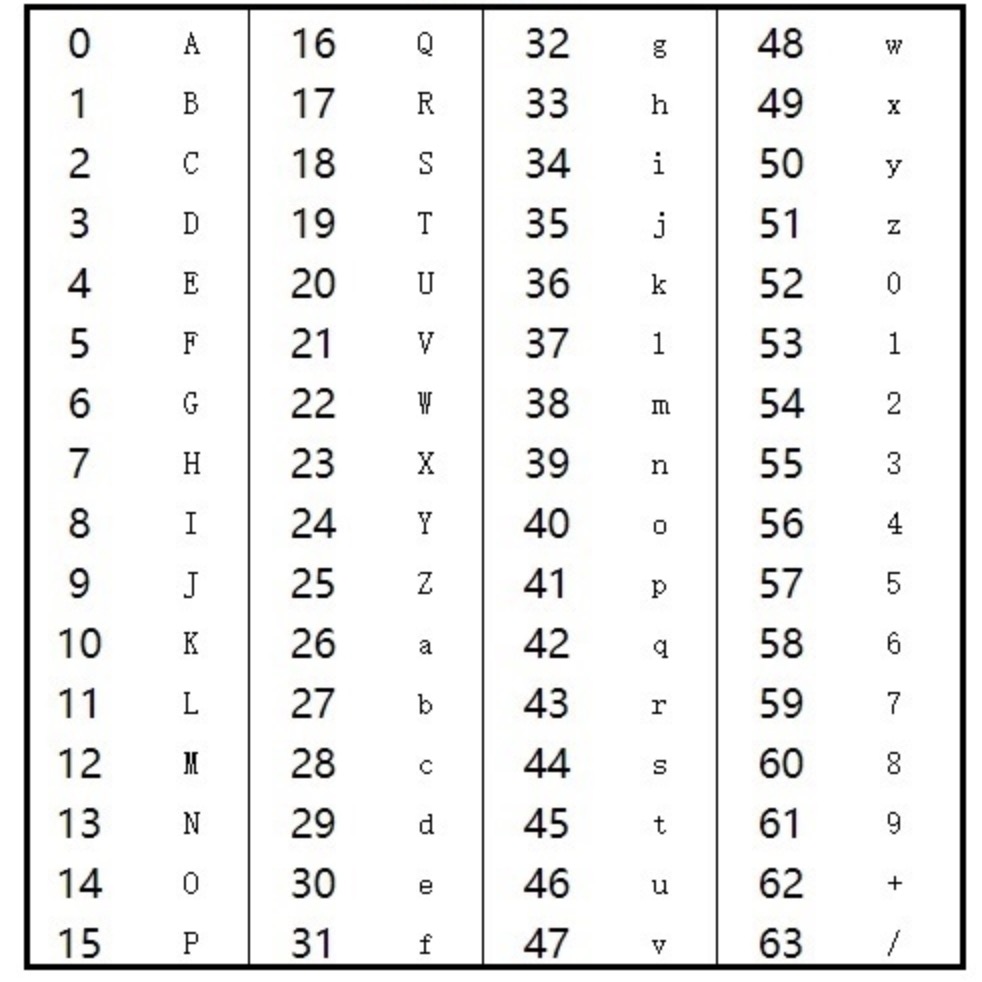 把这一堆二进制数,按6位bit分为一组,其值最小是000000,也就是0;最大是111111,也就是63。从0到63每个值都称为一个Base64索引(Base64 index)。每个Base64索引都对应了一个ASCII字符:一共使用了64个ASCII字符,大写字母A-Z、小写字母a-z、数字0-9,以及加号"+"和斜杠"/"。